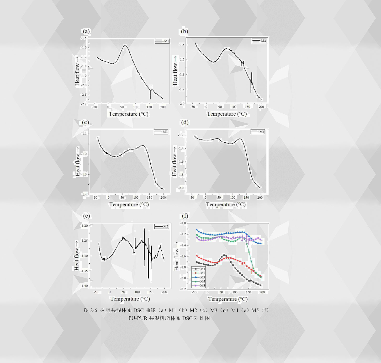PU-PUR共混樹脂的DSC曲線對其固化行為進行分析。從M1樹脂的DSC曲線2-6(a)上看到,曲線在35.41-86.16℃之間出現了一個明顯的放熱峰,這就是M1樹脂的固化反應峰,其峰值為59 .66℃。從M2樹脂的DSC曲線2 - 6(b)上看到,曲線在45.16-120.16℃之間出現了一個明顯的放熱峰,這就是M2樹脂的固化反應峰,其峰值為73.66℃。從M3樹脂的DSC曲線2-6(c)上看到,曲線在94.58-138.25℃出現了一個明顯的放熱峰,這就是M3樹脂的固化放熱峰,其峰值為125.08℃。從M4樹脂的DSC曲線2-6(d)上看到,曲線在98.58-140.83℃出現了一個明顯的放熱峰,這就是M4樹脂的固化放熱峰,其峰值為126.16℃。從M5樹脂的DSC曲線2-6(e)上看到,曲線出現了兩個較大的放熱峰,其中第二個較大的放熱峰位于96.50-138.08℃之間,其峰值為116.75℃。通過不同共混樹脂的DSC曲線對比2-6(f)可以看出,聚脲的加入使得共混樹脂放熱峰朝著較高溫度移動,而通過M3M4樹脂的曲線可以看出,當聚脲含量占到共混樹脂的50%以上時,共混樹脂的固化峰值變化不大。從共混樹脂的DSC曲線和樹脂流變測試結果分析得出,樹脂DSC曲線的峰值和樹脂流變粘度-溫度曲線轉變點的結果大致符合,因此2-3能夠作為樹脂共混體系的最佳固化溫度和時間使用。