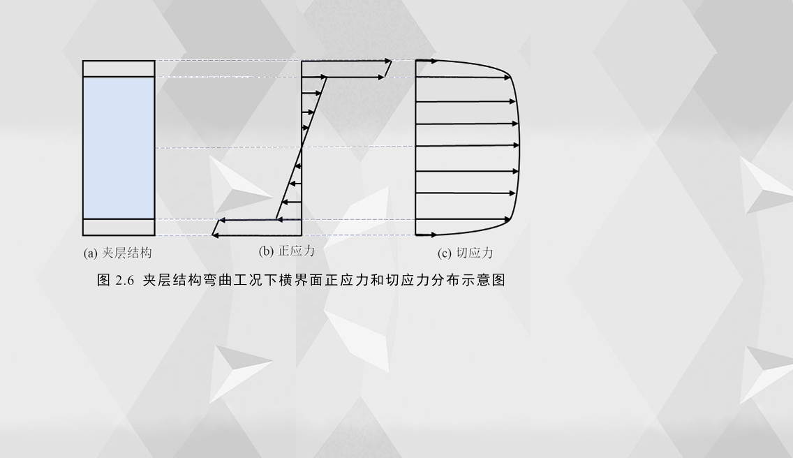 夾層結(jié)構(gòu)在三點(diǎn)彎曲工況下,其橫截面的正應(yīng)力和切應(yīng)力分布示意圖如圖2.6所示,夾層結(jié)構(gòu)的面板主要承受法向應(yīng)力,中間泡沫芯層主要承受切應(yīng)力。通常,彎曲工況下泡沫夾層結(jié)構(gòu)的失效形式有:泡沫芯層和面板的屈服、泡沫芯層的剪切裂紋和芯層與面板之間膠粘劑破壞導(dǎo)致界面分離等。當(dāng)面板承受的最大主應(yīng)力大于等于面板的屈服強(qiáng)度時,面板會失效;而當(dāng)泡沫承受的最大主應(yīng)力達(dá)到其單軸屈服強(qiáng)度或泡沫承受的最大剪應(yīng)力超過其剪切強(qiáng)度時,泡沫芯層會發(fā)生失效破壞;當(dāng)界面剪切應(yīng)力超過粘膠劑的剪切粘合強(qiáng)度時,界面分離就會發(fā)生。在彎曲加載過程中,夾層結(jié)構(gòu)會隨著位移的增加而發(fā)生明顯的變形,這種初始塑性變形稱為臨界失效模式;而后屈曲變形、破壞模式非常復(fù)雜,但基本上是幾種臨界失效模式的組合和擴(kuò)展演變。