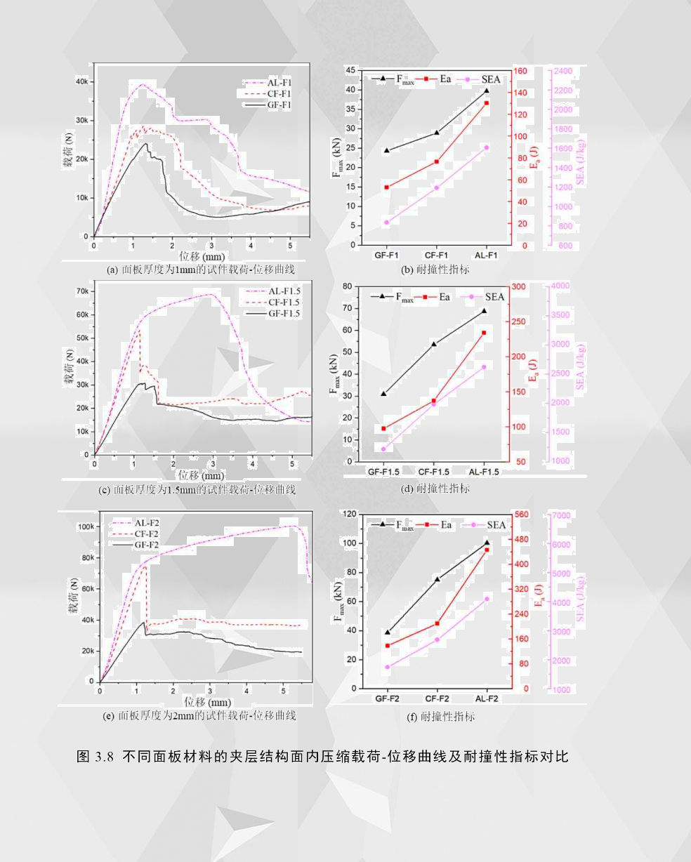 通過(guò)比較面板厚度相同但材料不同的夾層結(jié)構(gòu)載荷-位移曲線,如圖3.8所示,可發(fā)現(xiàn)鋁合金夾層結(jié)構(gòu)的曲線高度明顯高于同等面板厚度下的纖維增強(qiáng)夾層結(jié)構(gòu)。由于鋁合金面板的彈性模量比纖維增強(qiáng)復(fù)合材料的大,所以?shī)A層結(jié)構(gòu)在第一階段(彈性階段)的斜率最大,即剛度最大。從基材力學(xué)測(cè)試的數(shù)據(jù)可以看出,鋁合金面板的極限強(qiáng)度比纖維增強(qiáng)復(fù)合材料面板的強(qiáng)度要低,但通過(guò)耐撞性指標(biāo)可以看出,鋁合金夾層結(jié)構(gòu)具有最大的峰值力,造成這種現(xiàn)象的主要原因是由于面板為脆性材料的纖維增強(qiáng)夾層結(jié)構(gòu)的上、下面板之間尺寸誤差或裝配誤差的疊加效應(yīng)對(duì)載荷的損失比面板為彈塑性材料的鋁合金夾層結(jié)構(gòu)的要大得多,而這種疊加效應(yīng)對(duì)彈塑性材料的極限承載能力影響非常小,從而解釋了鋁合金夾層結(jié)構(gòu)比纖維夾層結(jié)構(gòu)具有更大的極限載荷。此外,在纖維增強(qiáng)夾層結(jié)構(gòu)的失效過(guò)程可以看出,纖維增強(qiáng)夾層結(jié)構(gòu)面板的脆性斷裂通常首先僅發(fā)生在某一面板,而不是兩面板同時(shí)脆性斷裂,這也解釋了面板疊加效應(yīng)的存在。通過(guò)不同面板材料的夾層結(jié)構(gòu)面內(nèi)壓縮的耐撞性指標(biāo)比較可以看出,在具有相同尺寸配置的前提下,鋁合金夾層結(jié)構(gòu)有最好的耐撞性能,而玻璃纖維夾層結(jié)構(gòu)有最差的耐撞性能。